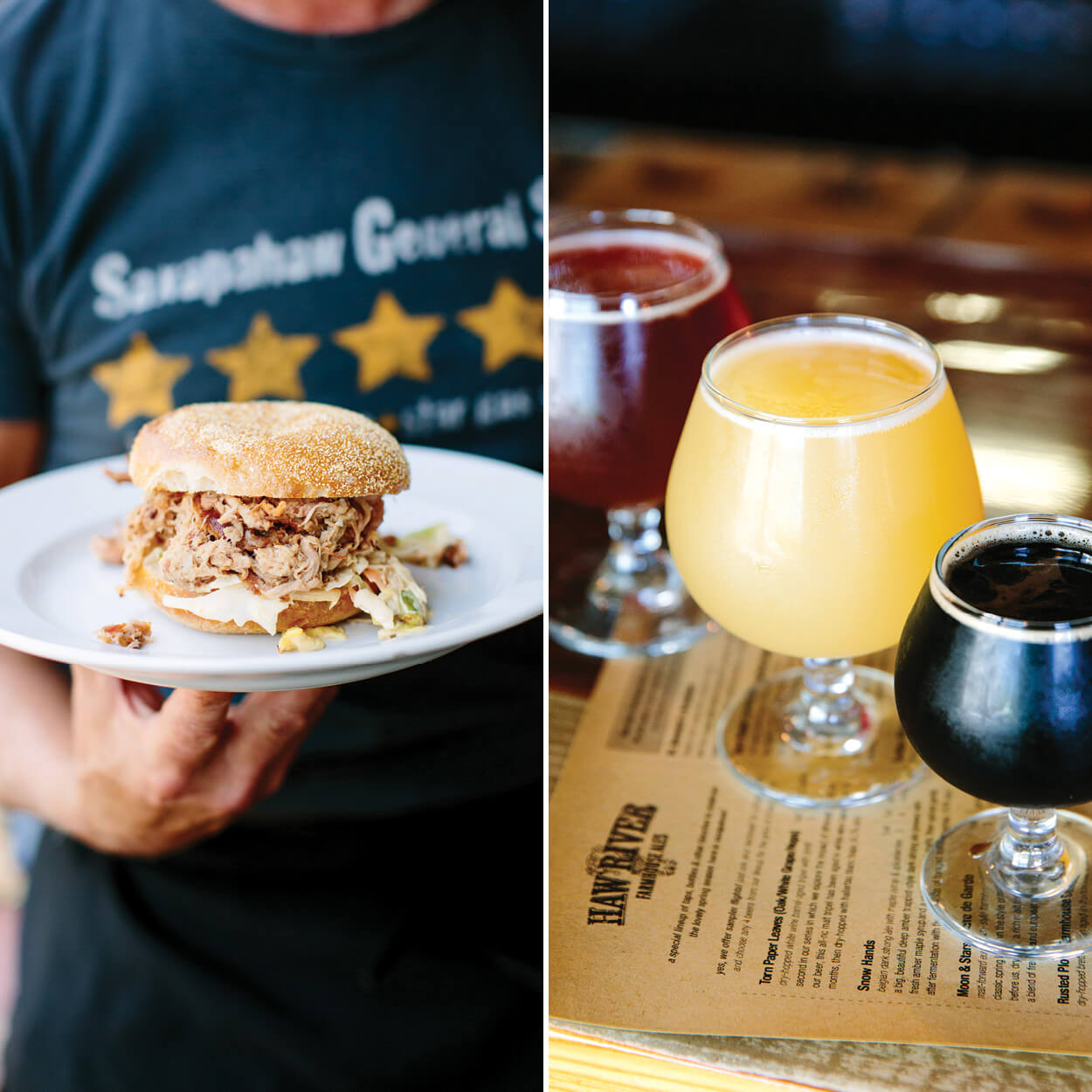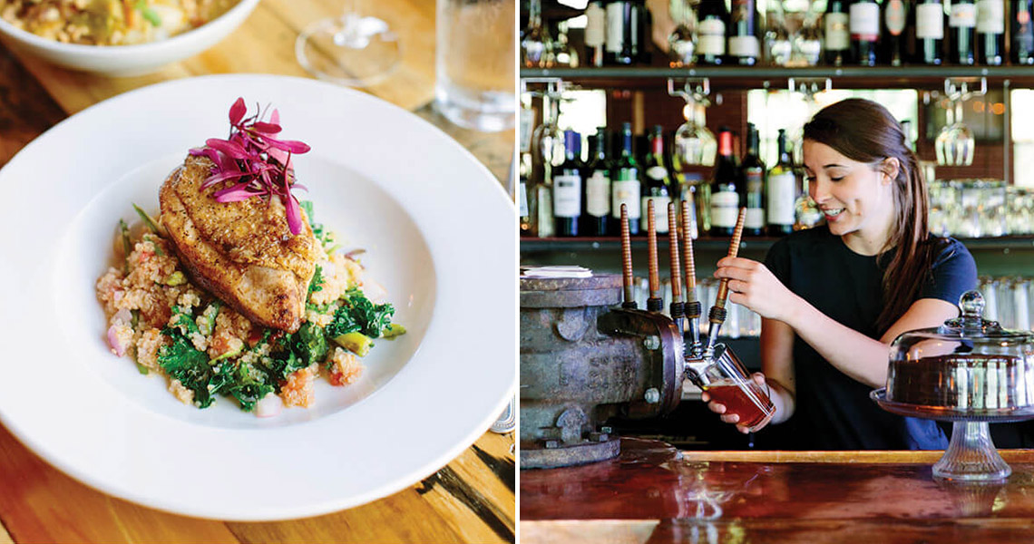 Saxapahaw may be small, but its culinary scene is mighty. Lemon honey chicken breast and a selection of North Carolina brews on tap are served at the Eddy Pub. photograph by Anagram Photo