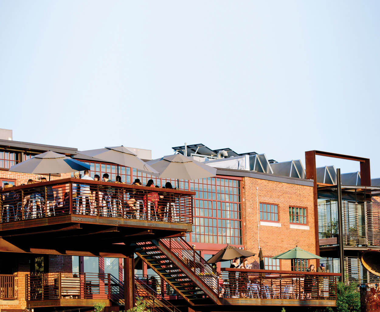 Snack on pimento cheese fries with a side of sunset at the Eddy Pub. On the second floor of the old cotton mill, the restaurant’s deck offers a sweeping view of the Haw River. photograph by Anagram Photo