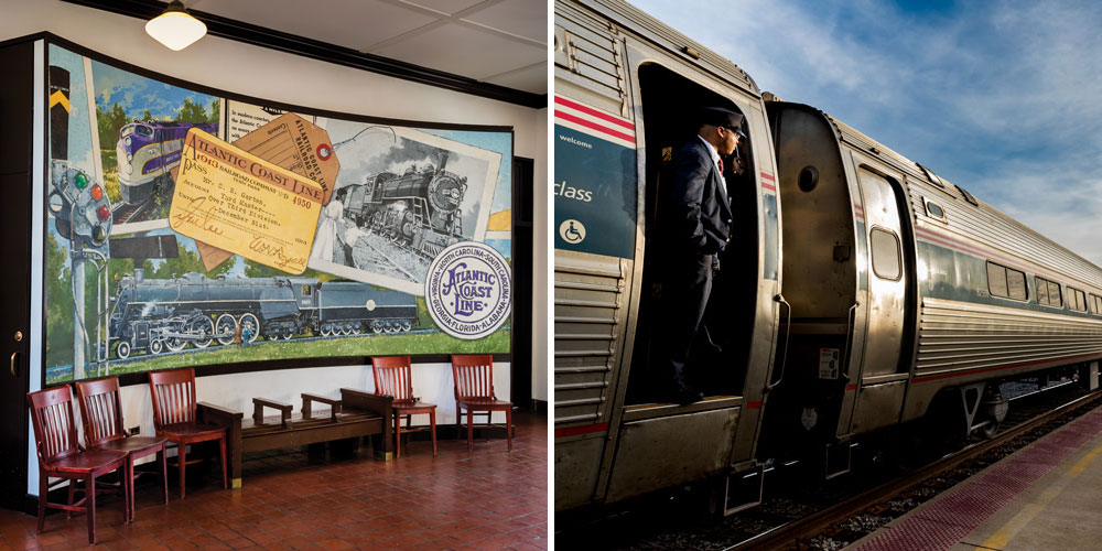 Art also plays a role inside the train station, built in 1924 by the Atlantic Coast Line Railroad, where a mural by North Carolina artist Michael Brown depicts more than 100 years of railroad history in Wilson. photograph by Charles Harris