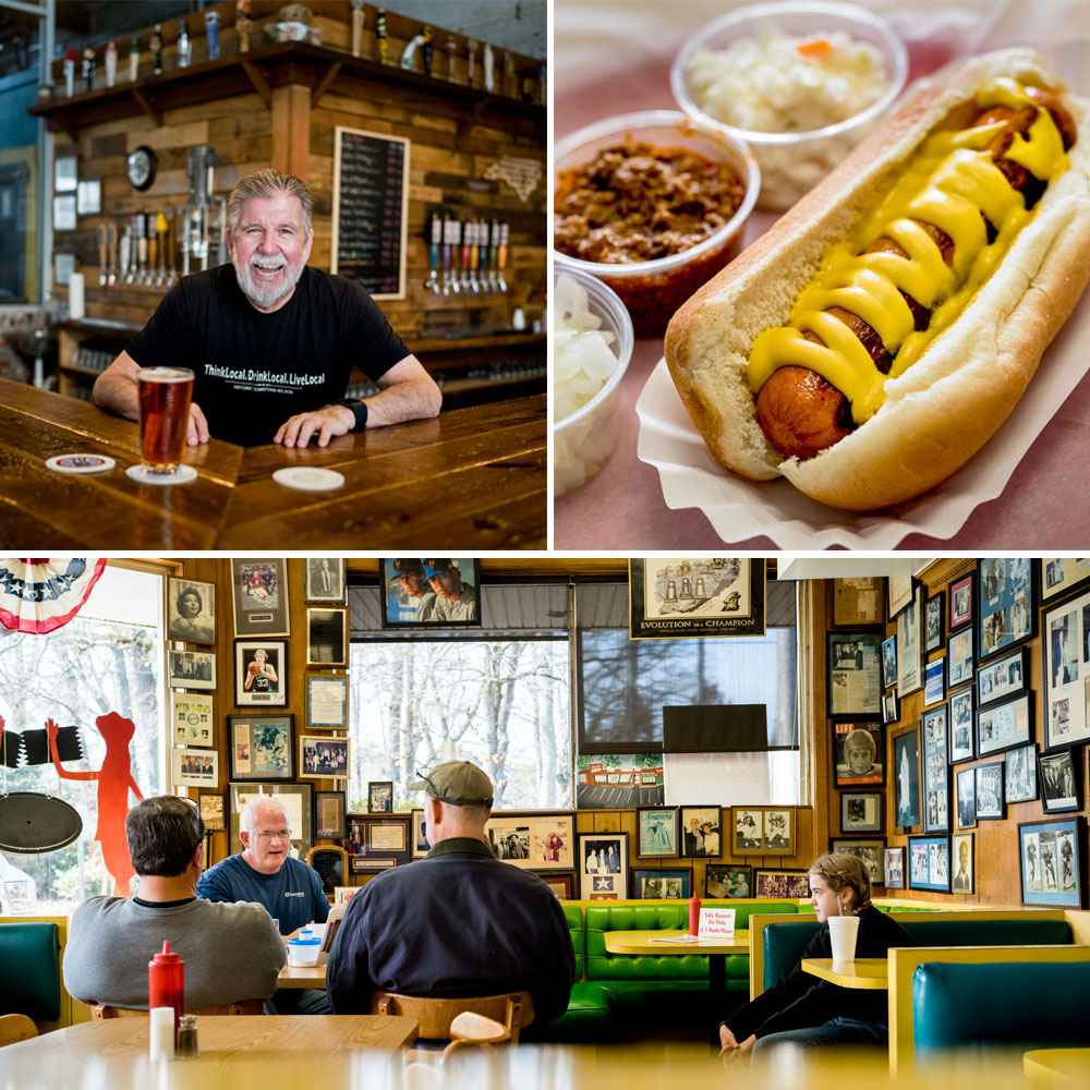 At Wilson’s first brewery, 217 Brew Works, owner Tom Curran (top left) encourages visitors to socialize, a concept that’s familiar to regulars at Dick’s Hot Dog Stand. A Wilson landmark, the restaurant has been an unofficial meeting place for locals for 97 years. photograph by Charles Harris
