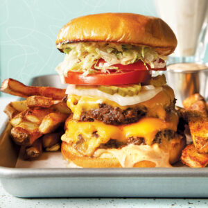 Spread butter on the inside of each bun half. In a separate skillet on medium heat, toast the buns cut-side down. Spread each bun bottom with about 1 tablespoon of the mayonnaise mixture. Transfer the double patties to the bun bottoms, followed by pickles, tomato, onion, and lettuce. Spread another dollop of the mayonnaise mixture on inside of bun top and place on burger.