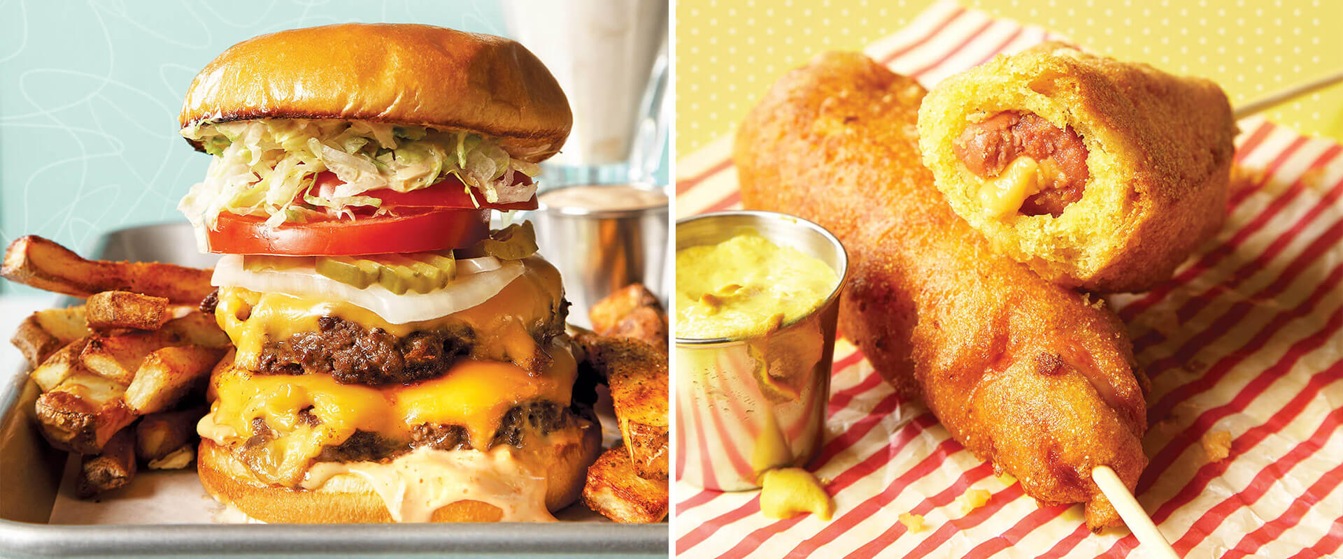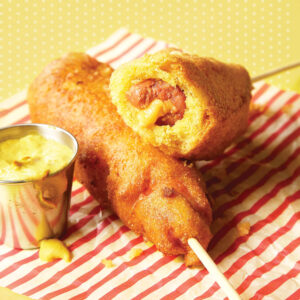 In a heavy-duty pot or Dutch oven, heat oil on medium-high to 350°. While the oil is heating, make a slit down each hot dog without cutting all the way through. Stuff each hot dog with a slice of bacon and ½ ounce of cheese. Insert wooden skewers into hot dogs lengthwise.