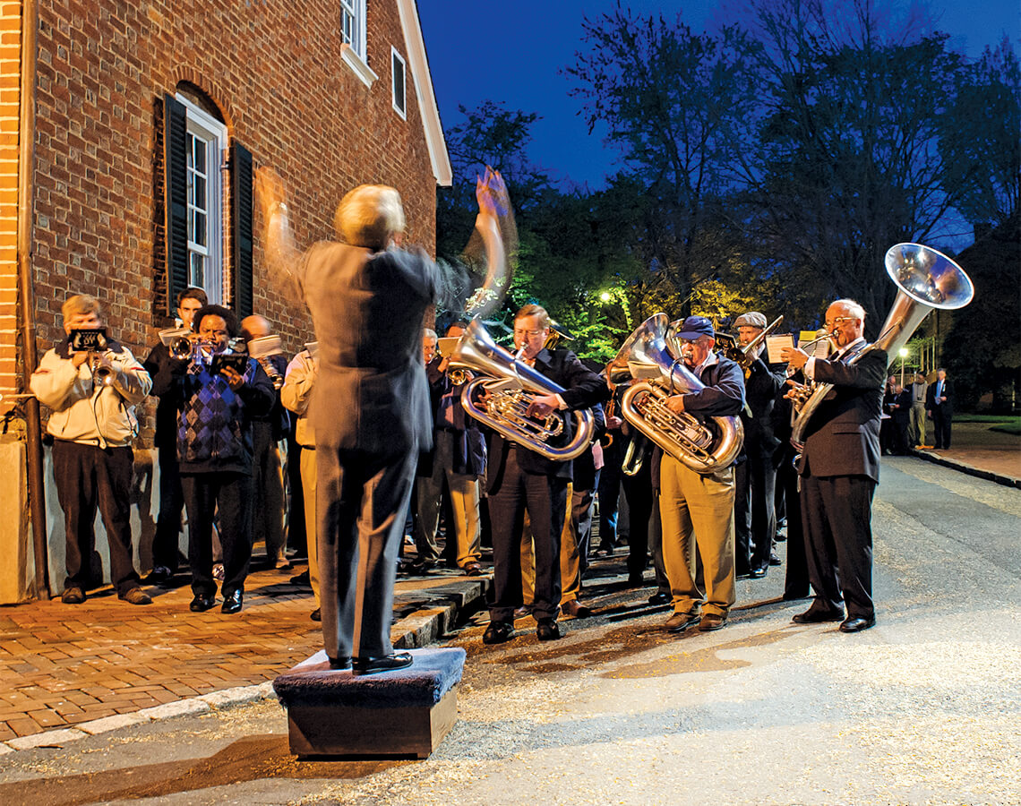 In the early hours of Easter morning, the opening notes of “Hail, All Hail, Victorious Lord and Savior” float up from brass and woodwind instruments in neighborhoods across Winston-Salem. Moravian Band members spread themselves throughout the city to awaken members of the church for the sunrise service, a celebration of the resurrection of Christ that has been held each year since 1772, and virtually during the pandemic. As the morning progresses, the smaller band groups converge on Old Salem, gradually joining together until four large groups can be heard playing antiphonally in front of the Home Moravian Church. The service begins when the presiding minister proclaims, “The Lord is risen!” Later, the congregation processes quietly to God’s Acre, the name given to all Moravian graveyards, where at last the full band joins together in triumphant glory as the sun rises. — Rebecca Woltz