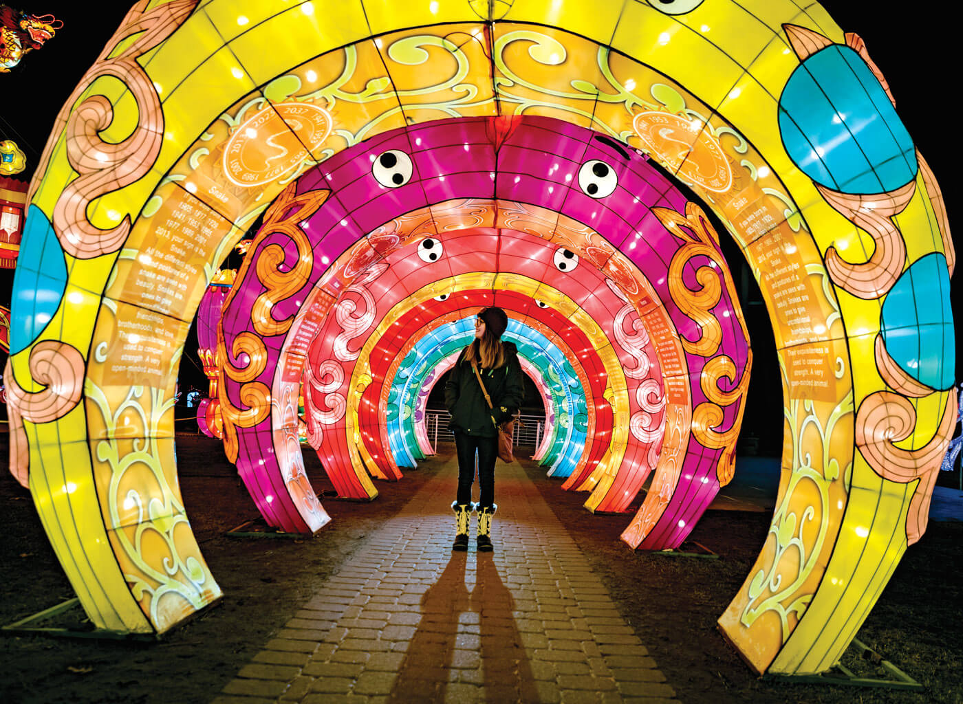 Thump, thump, thump. As kids pass through the entrance, their little gloved hands beat sticks on a drum lantern that changes color with each strike. A rainbow of lights dazzles overhead. But the main attraction is the silk tunnel at the center of the amphitheater: 12 brightly colored arches, one for each Chinese zodiac sign. Characteristics of the signs — their representative animals and years — are listed on their corresponding colors. “Mom, what animal are you?” one boy shouts as he weaves through the tunnel. Others excitedly exclaim, “I’m a tiger!” or “I’m a snake!” People huddle around specific arches — the magenta horse, the coral sheep, the pale blue rabbit — revealing loyalty to their respective signs.