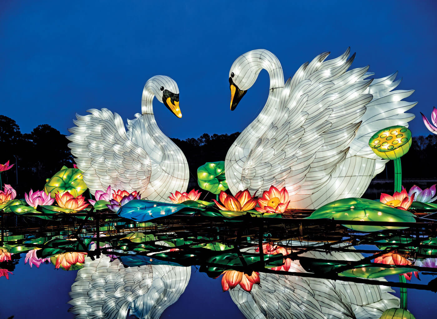 Large, luminescent swans rest gracefully on Symphony Lake during last year’s lantern festival. The festival’s displays change every year. photograph by Charles Harris