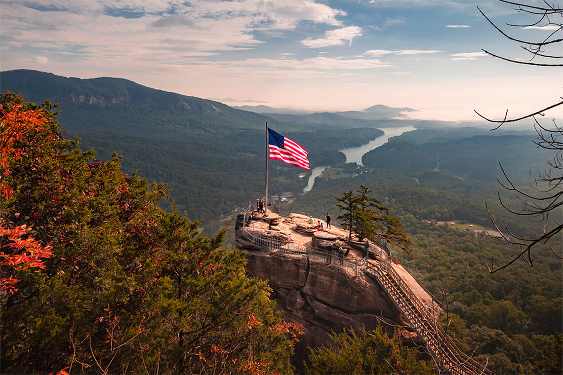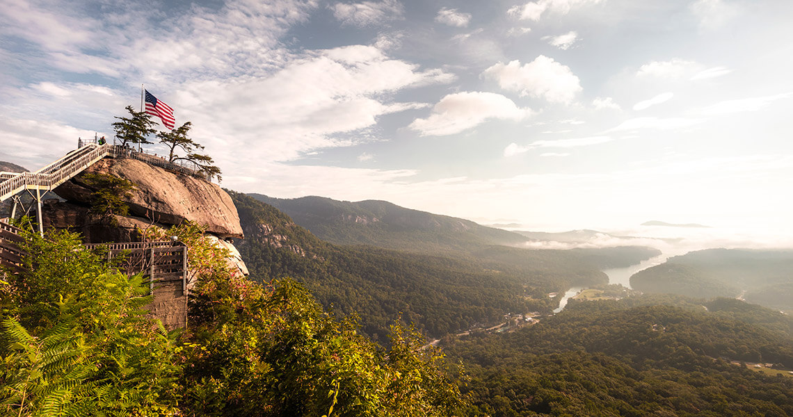 From the top of Chimney Rock, the views are spectacular; the Rocky Broad River widens into Lake Lure, and the Blue Ridge Mountains seem to go on forever.