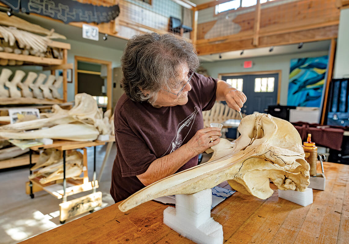 Eight more years have passed since then, and another public debut is planned: the unveiling of the new Bonehenge Whale Center in Beaufort, a workshop dedicated to the close relationship between North Carolina and the cetacean order of sea creatures, which includes whales, dolphins, and porpoises. Unlike the little pole barn that inspired this new venture, the center is an open, two-story building, approximately 2,000 square feet, adjacent to the NC Maritime Museum’s Gallants Channel Annex. A few rearticulated dolphins hang from the ceiling, while others are still in the process of being put back together at stations throughout the center. A giant mural along one wall depicts a mother Cuvier’s beaked whale and her calf. A balcony encircles the building’s interior, giving visitors a bird’s-eye view of the work spaces and the displays below.