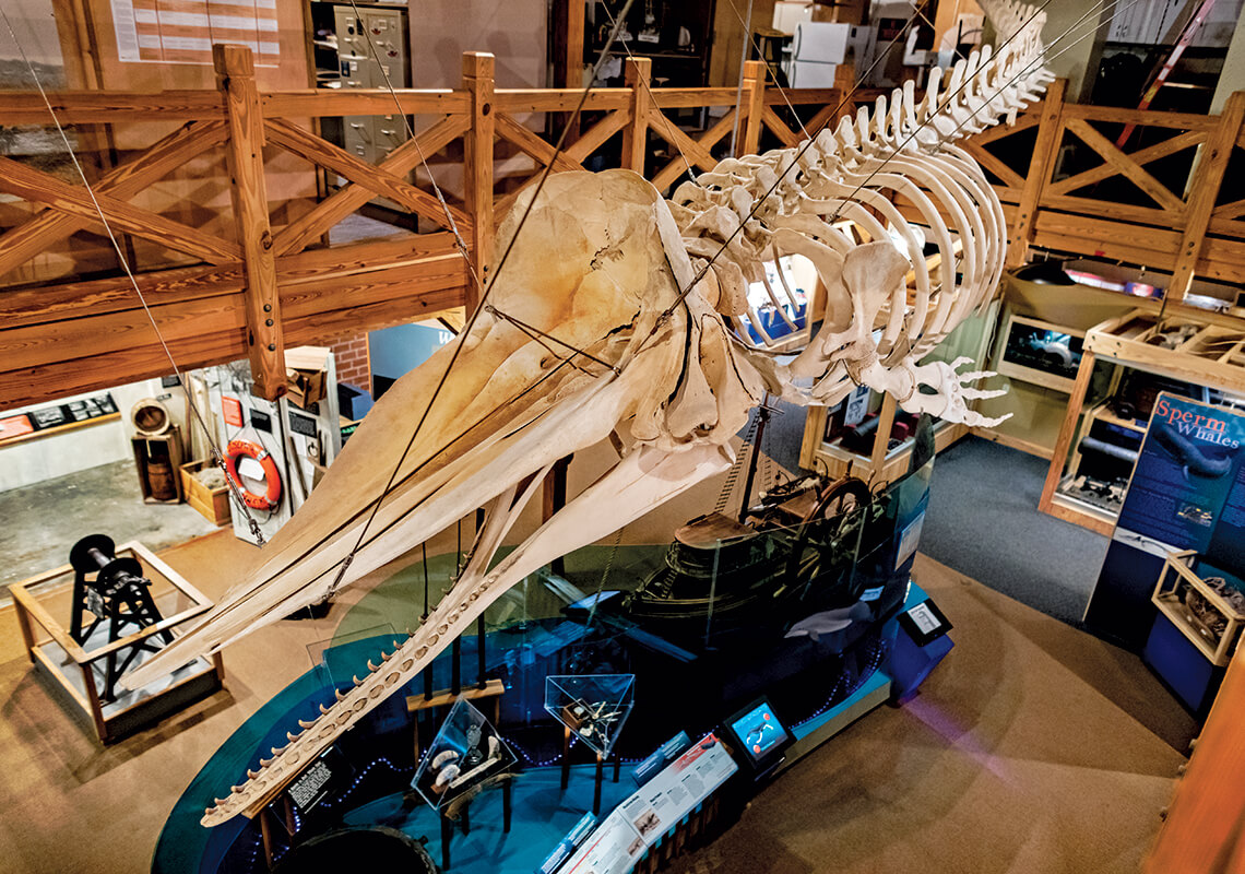 The beloved sperm whale “Echo” hangs above the other displays at the NC Maritime Museum in Beaufort. photograph by Charles Harris