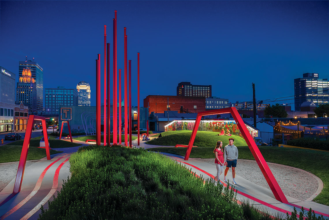 People come to ARTivity on the Green to enjoy live music, art festivals, and evening strolls around the red “Tower Cloud” at the center of the park. From April through October, the 13 “smokestacks” spout a cooling mist. photograph by Jerry Wolford & Scott Muthersbaugh