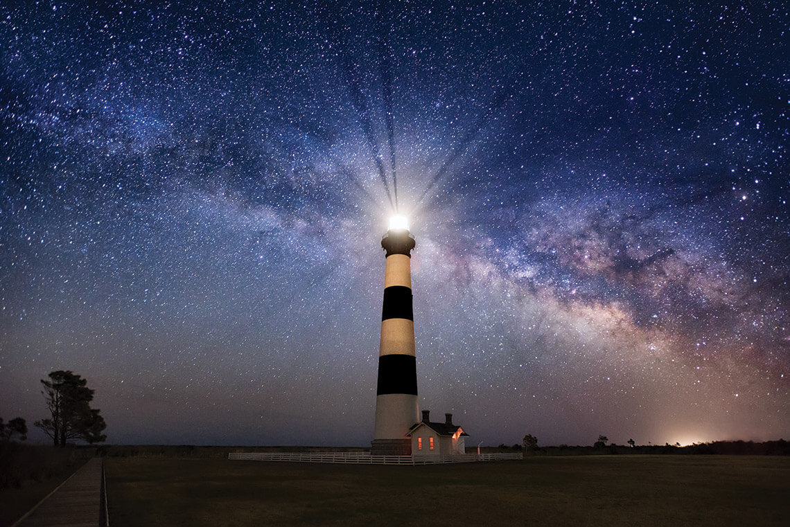 On Cape Hatteras National Seashore, Bodie Island Lighthouse adds its powerful beam to the Milky Way beyond. photograph by Tommy White