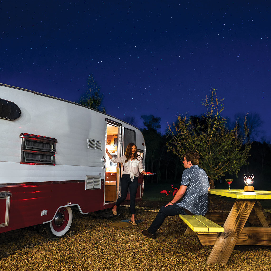 A vision of vintage campers dawned on Tom Pagano out of the blue: One morning, he turned to his now-wife, Charlene, and said, “We should open a retro park.” Charlene had no idea what that meant, but together, they brought Tom’s idea to life, and JuneBug Retro Resort opened in 2017. On 50 acres north of downtown Asheville, the Paganos operate a farm, wedding venue, and the retro rentals that Tom dreamed up — 10 vintage campers, restored to their mid-century glory and carefully decorated with era-appropriate fixtures. Each “little tin house” has its own unique personality, Charlene says, like the flamingo-print curtains that hang in JuneBug’s 1959 pink Shasta. At night, guests gather around the communal firepit to chat and share memories — many say that the campers transport them back to family vacations from childhood.