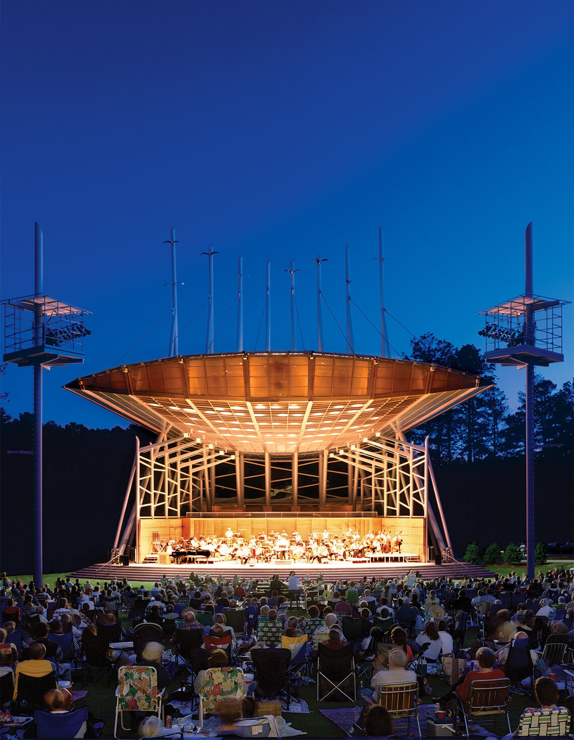 Like a secret hideaway tucked in the trees, Koka Booth Amphitheatre is a place apart. On the shores of Symphony Lake, people set up lawn chairs around the glow of a stage that’s cradled in the woods. The amphitheater, named for a former Cary mayor, is modern and spacious — it can accommodate 7,000 — but a performance there can feel as down-home and intimate as a backyard concert. Koka Booth has filled warm summer nights with classical music and jazz, bluegrass and rock since it was built in 2001. Yet it fits so naturally into its surroundings that it feels like it’s always been there, deeply rooted in the land of the longleaf pine.