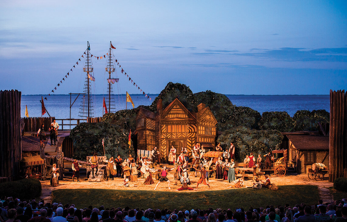 A sky full of stars and the deep blue waters of Roanoke Sound provide the backdrop for The Lost Colony — just as they did when the actual colonists arrived on Roanoke Island in 1587. Fascinated by the vanished settlement, Chapel Hill playwright Paul Green made it the subject of a “symphonic drama” that debuted in 1937. To prepare for that first production — attended by President Franklin D. Roosevelt — Albert Quentin “Skipper” Bell, an Englishman who specialized in skills like thatching and constructing log buildings, created the Waterside Theatre in about six months. Since then, the amphitheater has been destroyed by fire and flood, rebuilt, and improved, but it still resembles Bell’s original design — as enduring as the play’s central mystery.