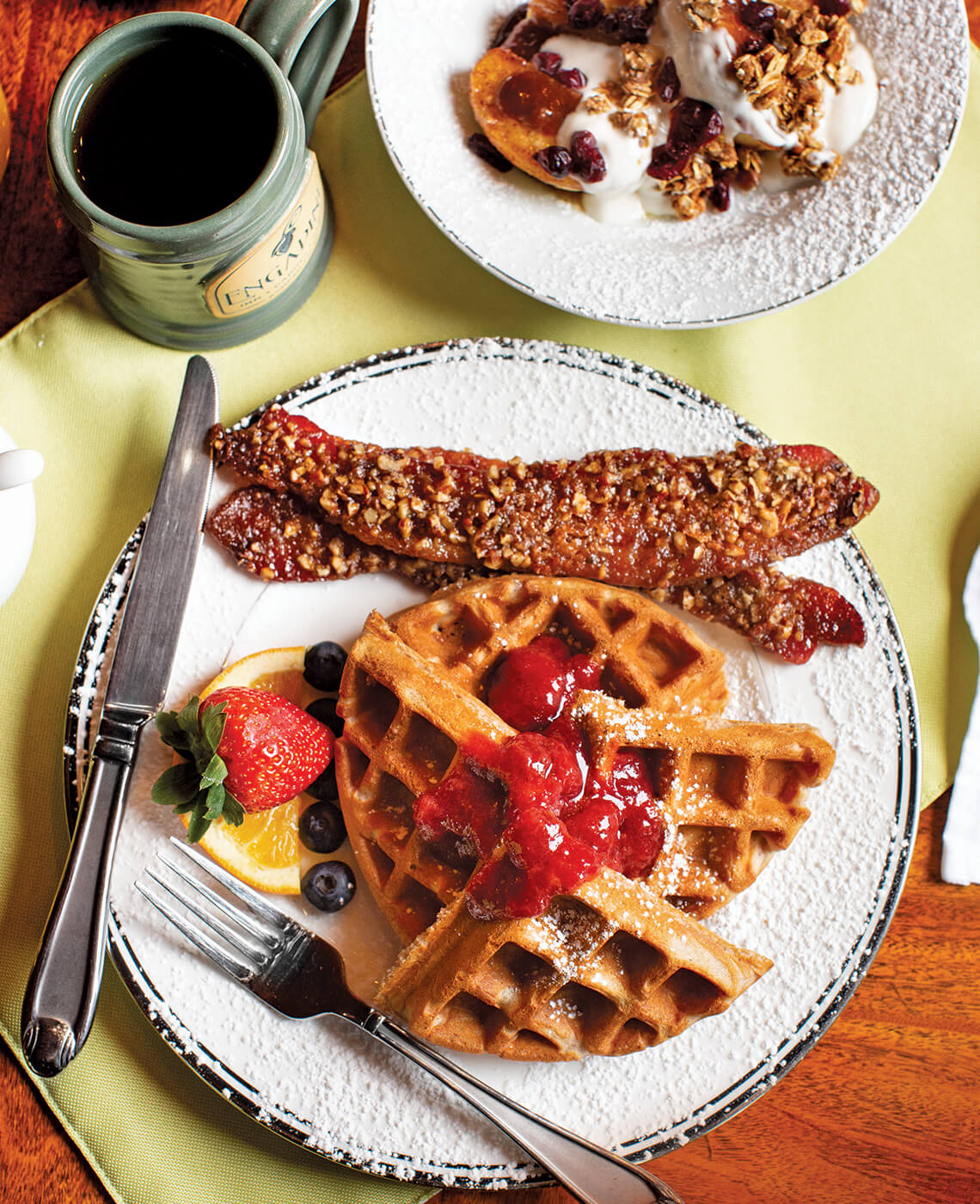 When Engadine’s current owners bought the inn in 2014, they held on to a breakfast tradition: applewood bacon with brown sugar and pecans. photograph by Tim Robison