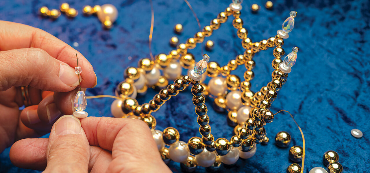 Today, as the crafters from Texas prepare to make their own ornaments, one of them surveys the materials before her — 132 gold, pearl, and crystal beads in varying sizes and shapes, and a three-yard strand of gold wire. She picks up the wire, and her eyes dance quizzically between it, the beads, and a dazzling 3D crown displayed nearby. “We’re going to string the beads on this wire, and it will become that ornament,” she says to Beaver. “Is that right?”