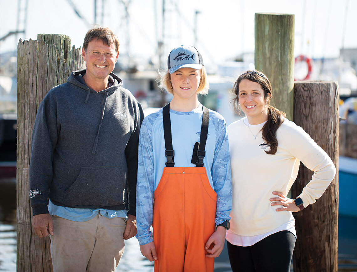 Matt Huth (left) began crabbing in Albemarle Sound when he was 14. Now, as co-owner of Fresh Catch with his wife, Micah, he fishes for tuna, swordfish, mahi, and more — often with his son, Finn. photograph by Chris Hannant