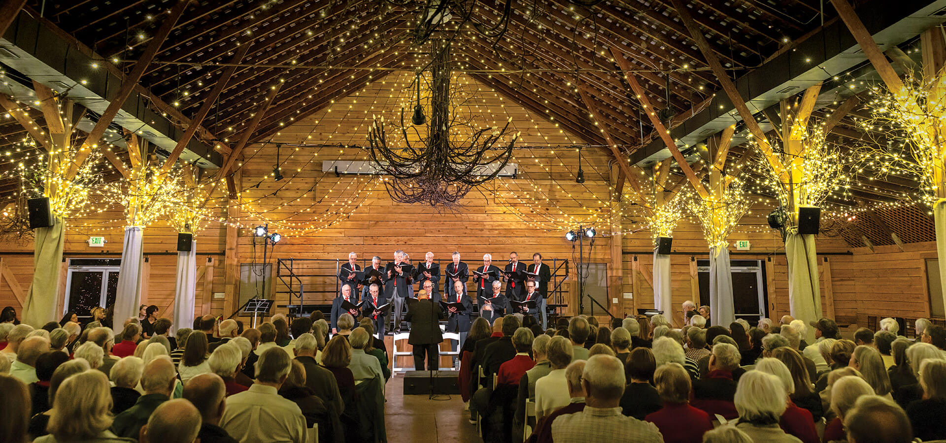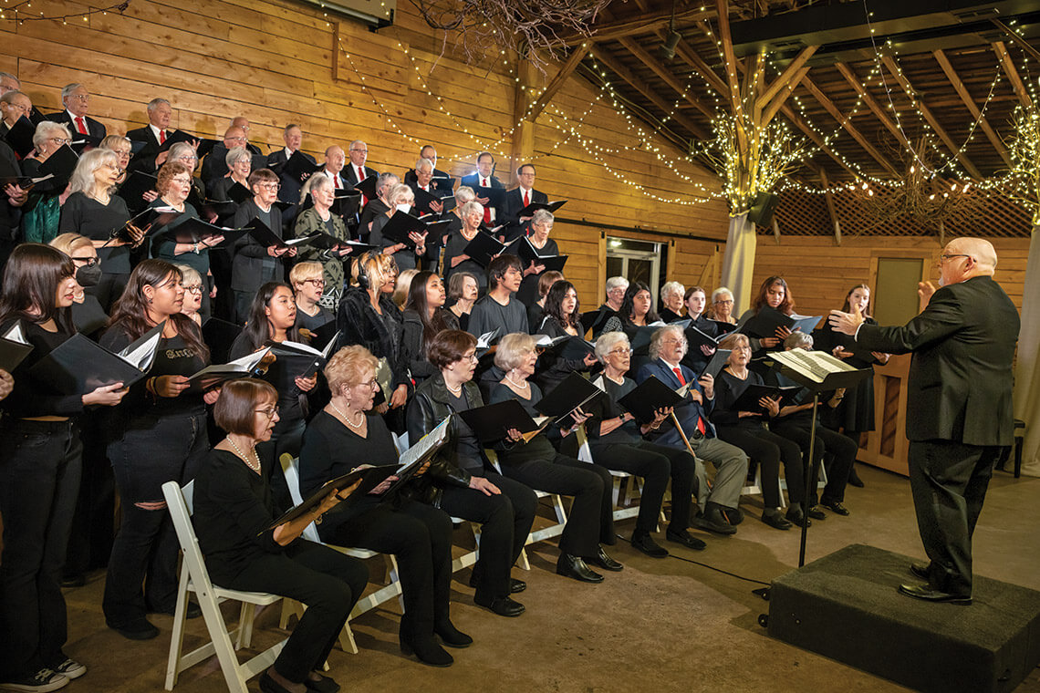 With thousands of tiny, twinkling lights casting a warm, golden glow on the faces of the singers in front of him, Matt Fry raises his arms. He turns and cues pianist Daniel Steinert, who begins playing “Hodie Fanfare” brightly in 10/8 time. After four bars, the sopranos join the piano, their voices soaring into the rafters. Next come the altos, then the tenors. Finally, the deep, resonant rumble of the basses joins the harmony in a round of “Gloria, Gloria!” As the joyous song progresses, the entire chorus sings in unison, Hodie Christus natus est! Today, Christ is born!
