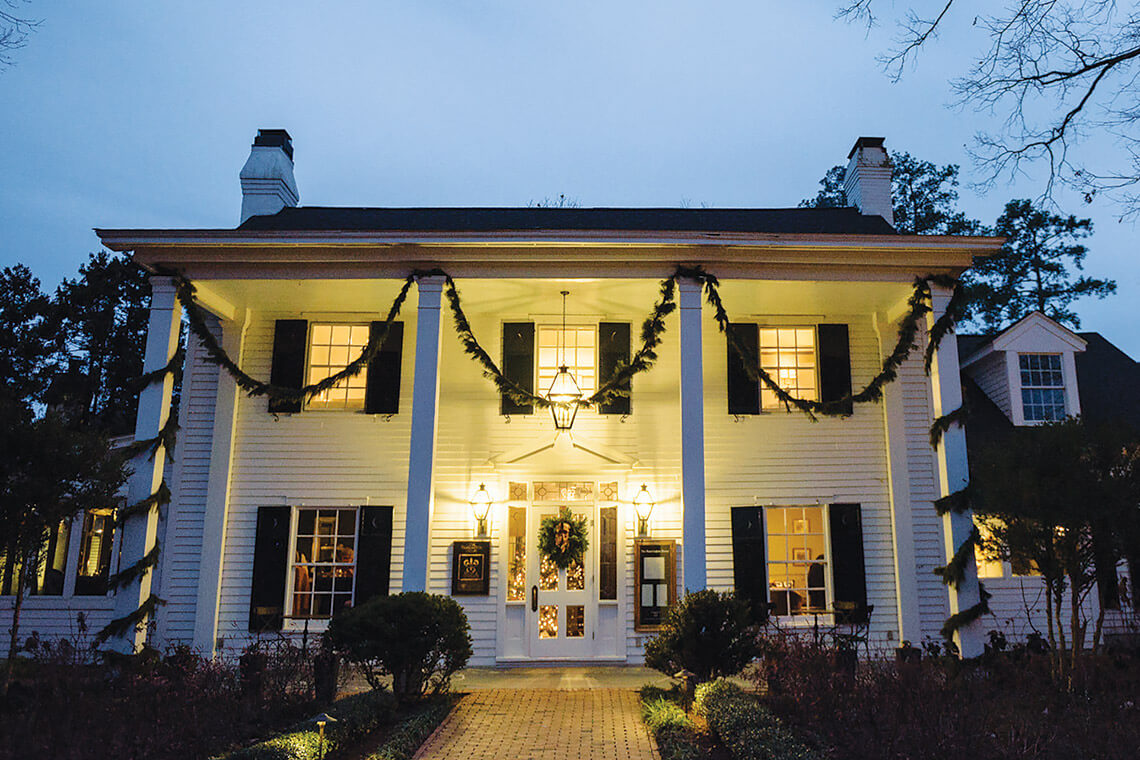 During the holidays, Fearrington House Restaurant guests are greeted with pine garland and a wreath on the door — as classic and elegant as the inn itself. Photography courtesy of KRYSTAL KAST/FEARRINGTON VILLAGE