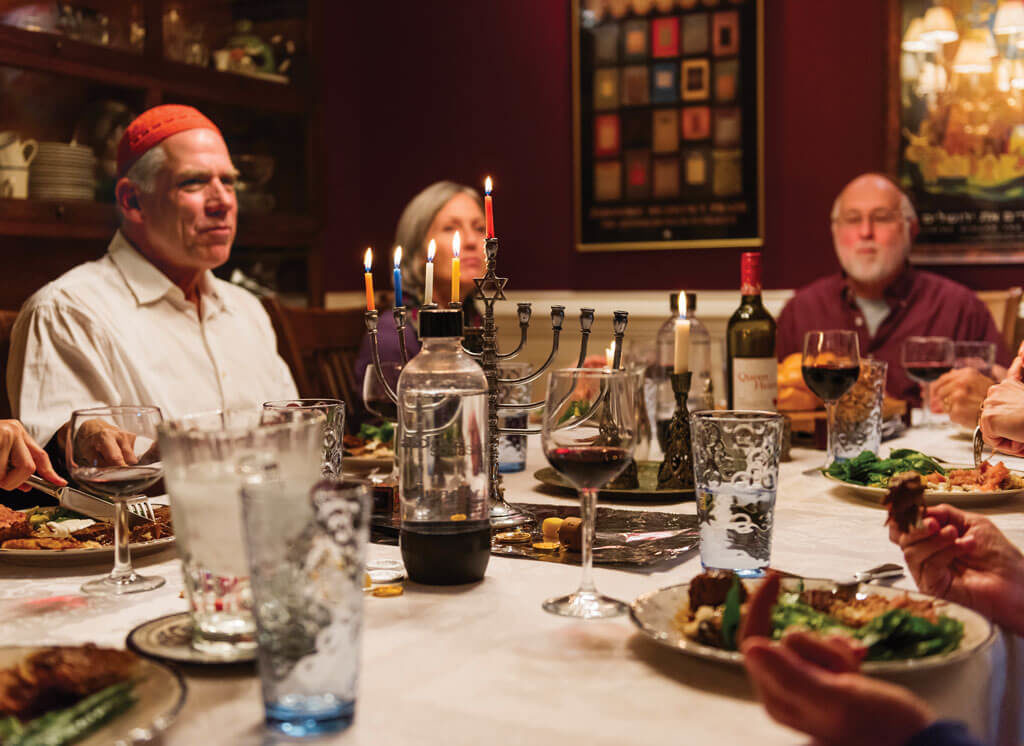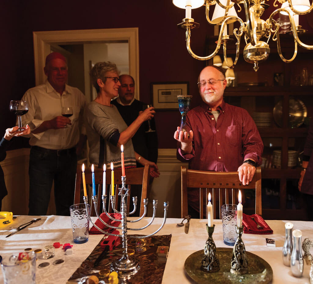 UNC Asheville professor Richard Chess (center) celebrates the fourth night of Hanukkah with John Wood (left), Judy Hoffman, Alan Baumgarten, and others. photograph by Jack Sorokin