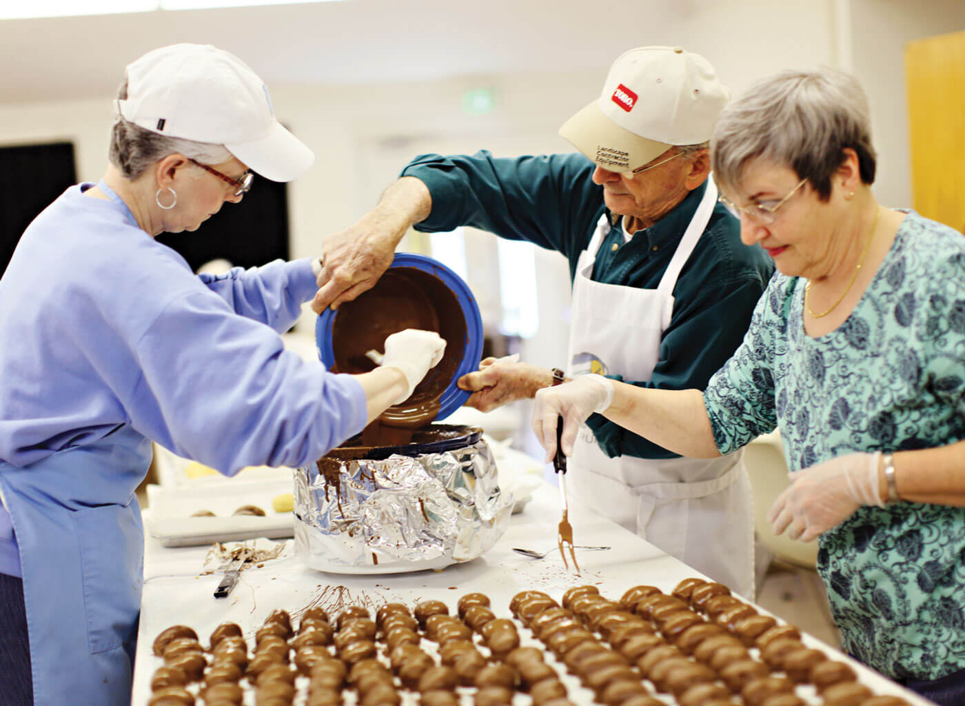 The workers make a merry din. In the kitchen, an industrial mixer churns the cream filling while volunteers known as “holy rollers” use ice cream scoops and gloved hands to shape the fluffy centers. Gil Sheets, an 83-year-old retired Navy man, explains why he has helped since the candy-making began: “They shackled me to the table leg.”
