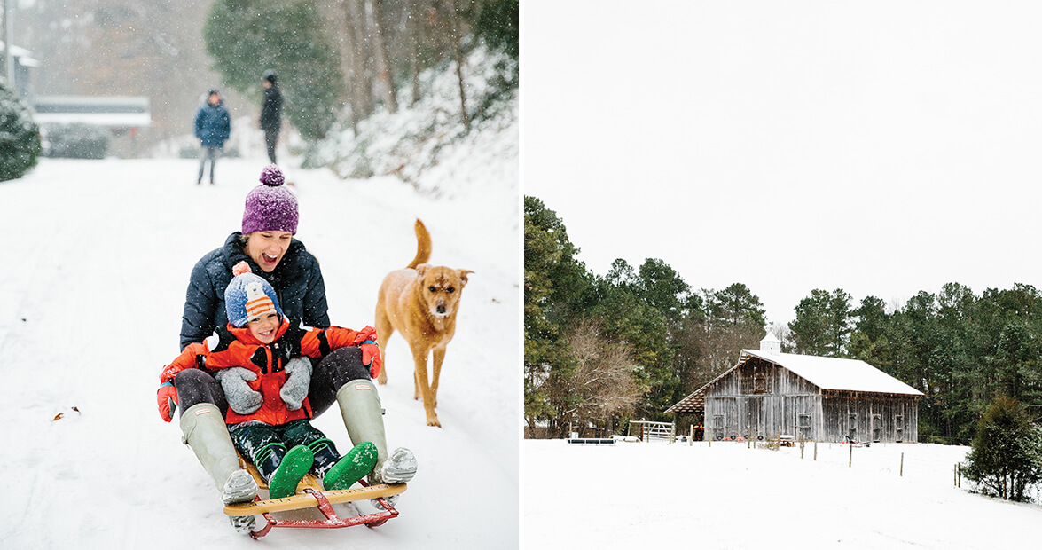 Featured images, above: Snowy scenes in Chapel Hill: Samantha and Perry Terhune sled down their driveway with Bolo the dog, and flakes fall on a barn on Mount Carmel Road.