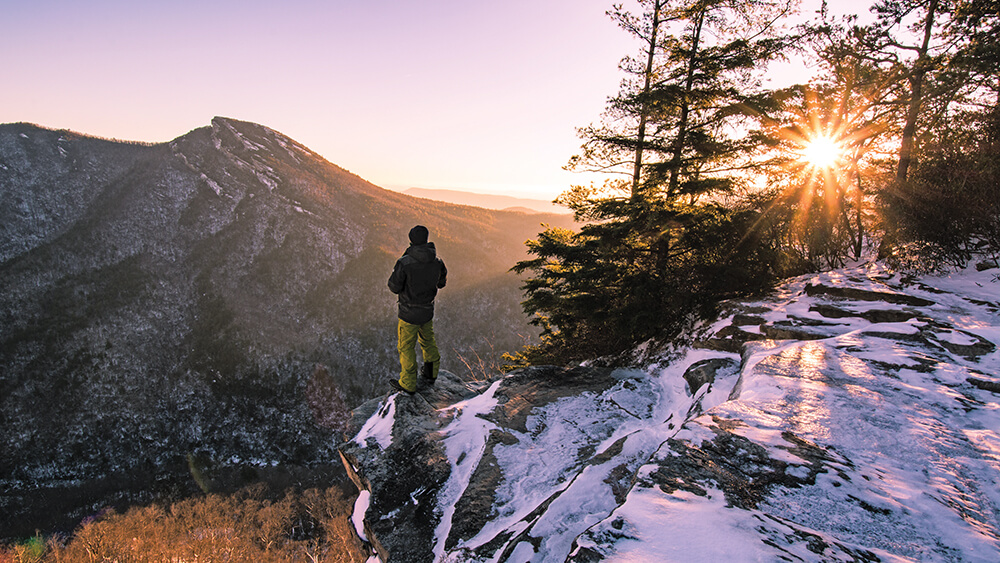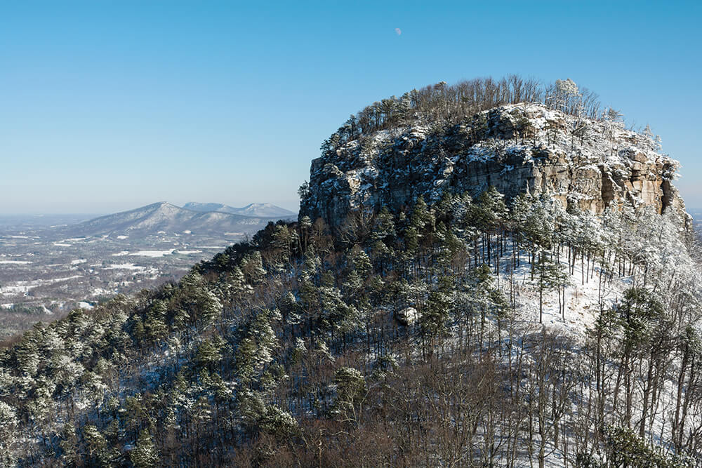Even when snowfall closes Pilot Mountain State Park to vehicles, winter hikers arrive on foot, seeking the best view of Big Pinnacle — from atop its neighbor, Little Pinnacle. photograph by Jeff Silkstone