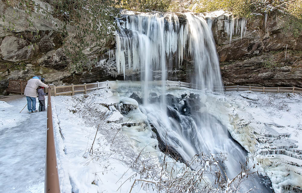 Whereas much of the state falls silent under a blanket of snow, the waterfalls of western North Carolina roar as loudly as ever. But on the coldest days of winter, something magical happens at Dry Falls outside Highlands: Some of the water’s spray freezes, forming spectacular ice formations like stalactites in a cave. Here, frigid temperatures and rushing water work together to preserve a moment in time — and, for a young hiker out for an adventure with Dad, a shared memory.