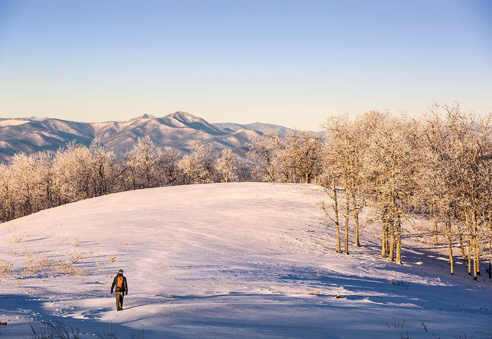 A snowy walk on Bearwallow Mountain offers views of an equally frosty Mount Pisgah, and Cold Mountain beyond. photograph by Jared Kay