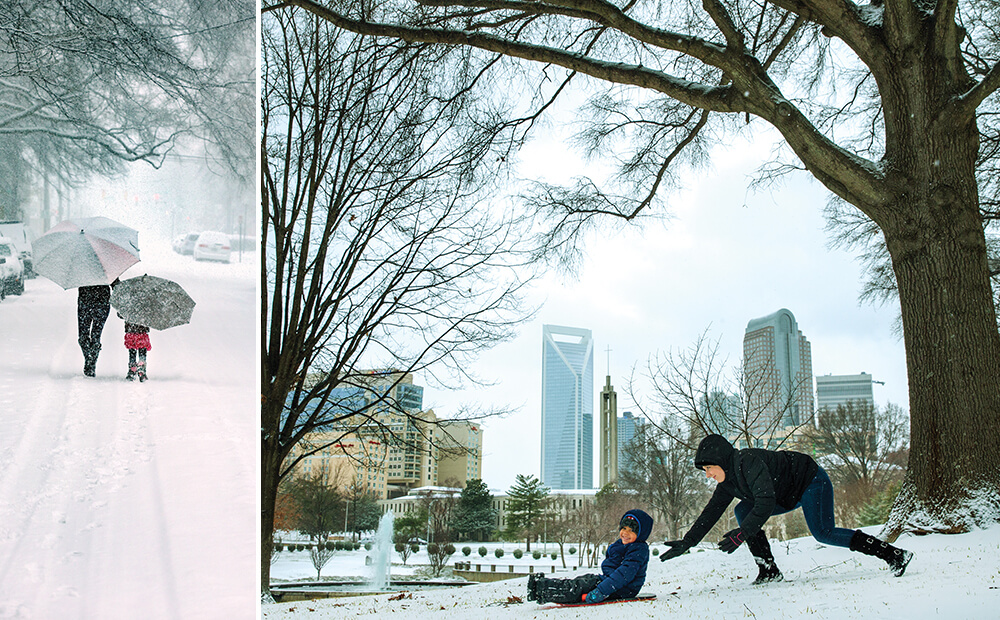 When big, frosty flakes turn Charlotte into a giant snow globe, residents find winter wonderlands all over the city. Some make tracks in fresh powder in the Dilworth neighborhood (above). Others tote their sleds to any snowy expanse they can find. Uptown’s Marshall Park (right) may not be especially hilly, but it offers views of the skyline.