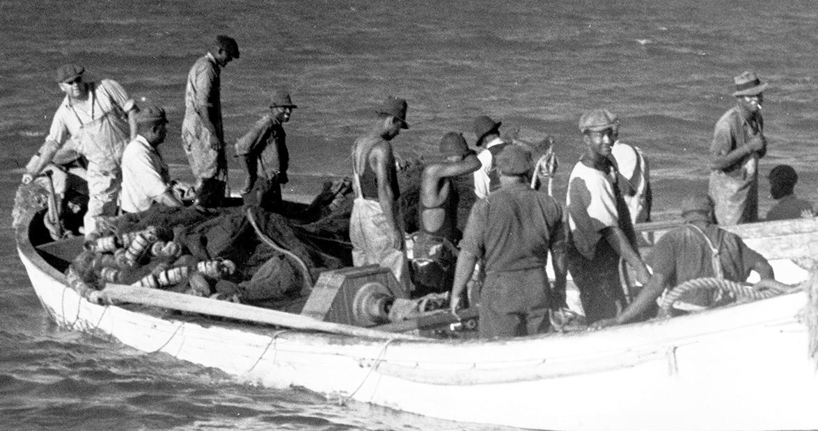 Once the striker man pointed out the school, two bigger wooden boats would be lowered into the water. Each boat was boarded by at least a dozen men — these men were almost exclusively black — who encircled the school with a purse seine net.