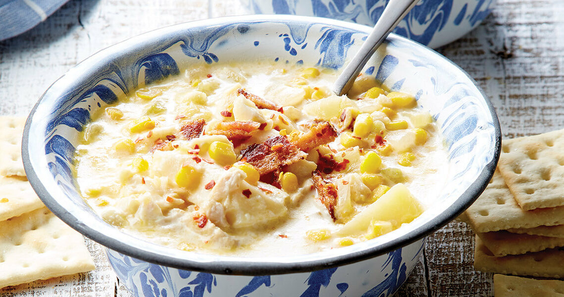 Stir in corn, milk, and cream, and simmer for 10 minutes. Stir in fish and black pepper. Continue to simmer for an additional 3 minutes until corn is heated through. Remove and discard bay leaves. Crumble bacon on top, sprinkle with crushed red pepper flakes, and serve.