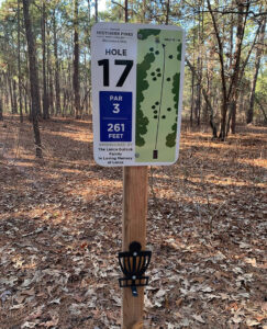 In Robbins, the Bear Creek course is part of the 14 miles of trails that make up the Bear Creek Trail System. A different organization sponsors each hole, including a “practice basket preschool” by the Northern Moore Family Resource Center. Learn more about the length and par of each hole at their website.
