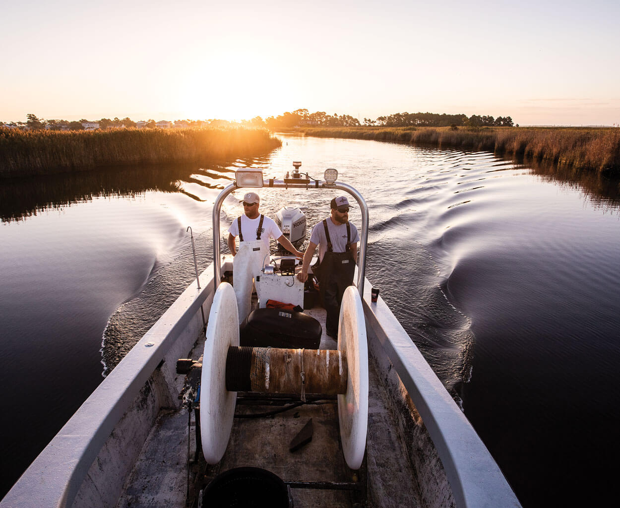Brothers Chad and Carson Dunn, cups of Circle K coffee and cigarettes close at hand, are motoring north on NC Highway 12 heading to Chad’s fishing boat, docked inside a Kitty Hawk subdivision. Within minutes of arriving, and before the sun has crested the loblolly pines, the brothers have donned Grundens bib overalls and set out into Albemarle Sound to see what’s turned up in the gill nets that Chad set out the day before.