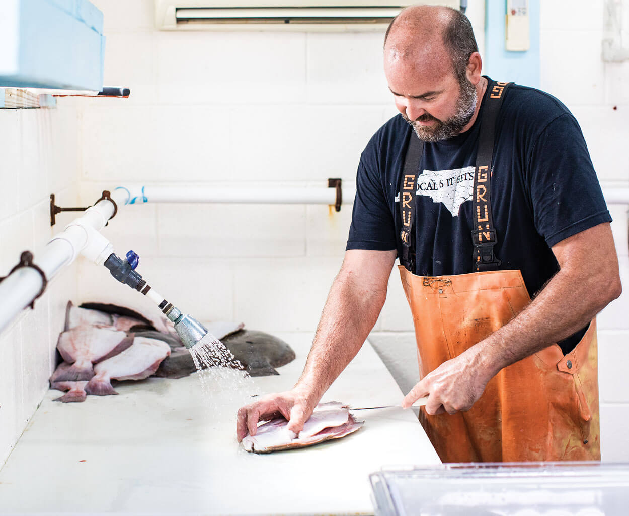 Their father, Charlie Dunn, who left Delaware decades ago to be a sport fisherman, knows intimately the life his sons have chosen. “I tried to discourage them as hard as I could,” says Charlie, who now cuts fish at Locals Seafood, a Raleigh-based fish and shellfish seller focused on North Carolina seafood. “It’s a hard life. No set hours. When it’s there, you got to get it. If it’s not there, you got to find it.”