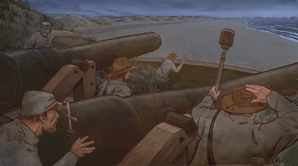 Confederate soldiers on Fort Fisher’s 43-foot-tall Mound Battery prepare to battle the advancing Union armada. The fort survives pounding from the Union’s ships, but the majority of its seaside batteries are claimed by the ocean during the next 150 years. photograph by David Stanley