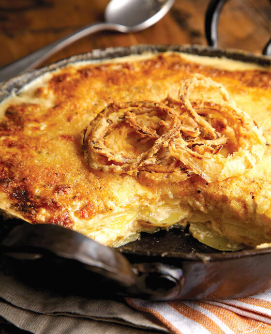 Slice potatoes ¼-inch thick. Arrange a third of the potatoes in baking dish, overlapping so there are no gaps, and spread with a third of the cheese mixture. Repeat layering twice, finishing with cheese. Pour heavy cream over potatoes and place bay leaf on top. Bake until cream is mostly absorbed and top is golden brown and bubbling, about 1 hour. Remove bay leaf. Sprinkle top with Parmesan cheese, and bake for an additional 15 minutes or until Parmesan is golden brown. Let cool for 10 minutes before serving. Top with fried onions.
