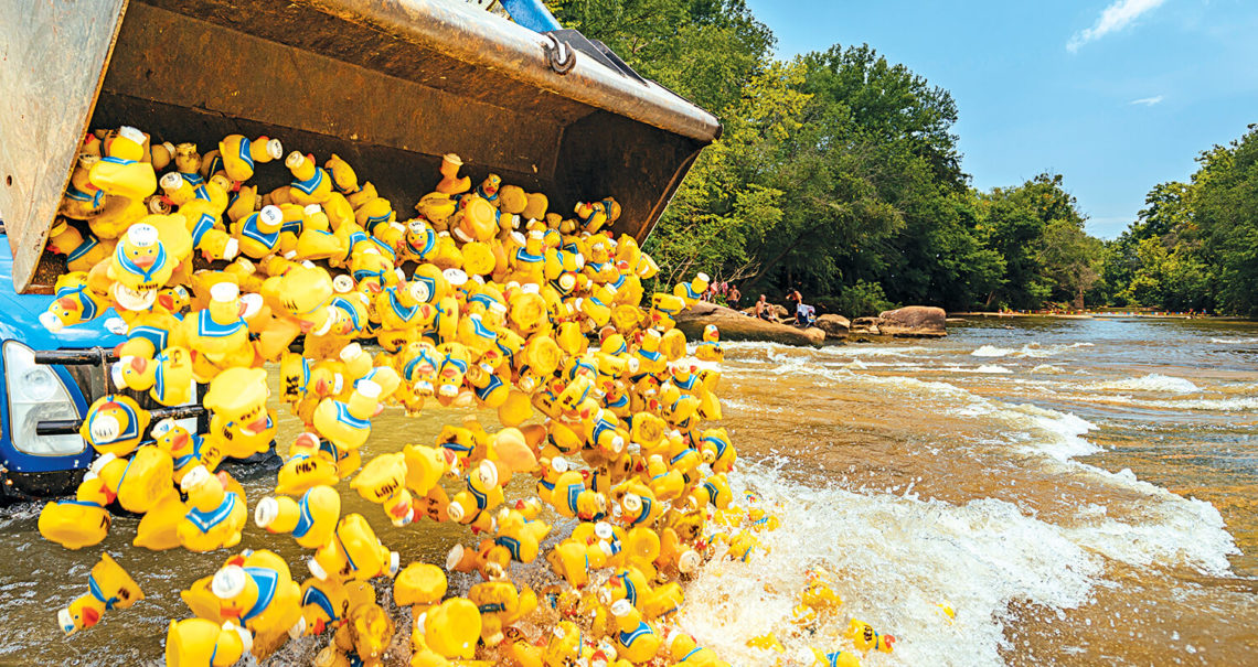 A tractor with a bucket loader inches into the South Yadkin River at the border of Davie and Rowan counties, and dumps a thousand little yellow rubber duckies into the rushing water. Spectators along the shoreline cheer as the tiny sailors hurtle down a 100-yard stretch of river, jockeying for position, navigating rocks and stray limbs, their bright eyes looking straight ahead as they bob frantically to the finish line. From beginning to end, The Great Bullhole Duck Race lasts maybe 15 minutes.