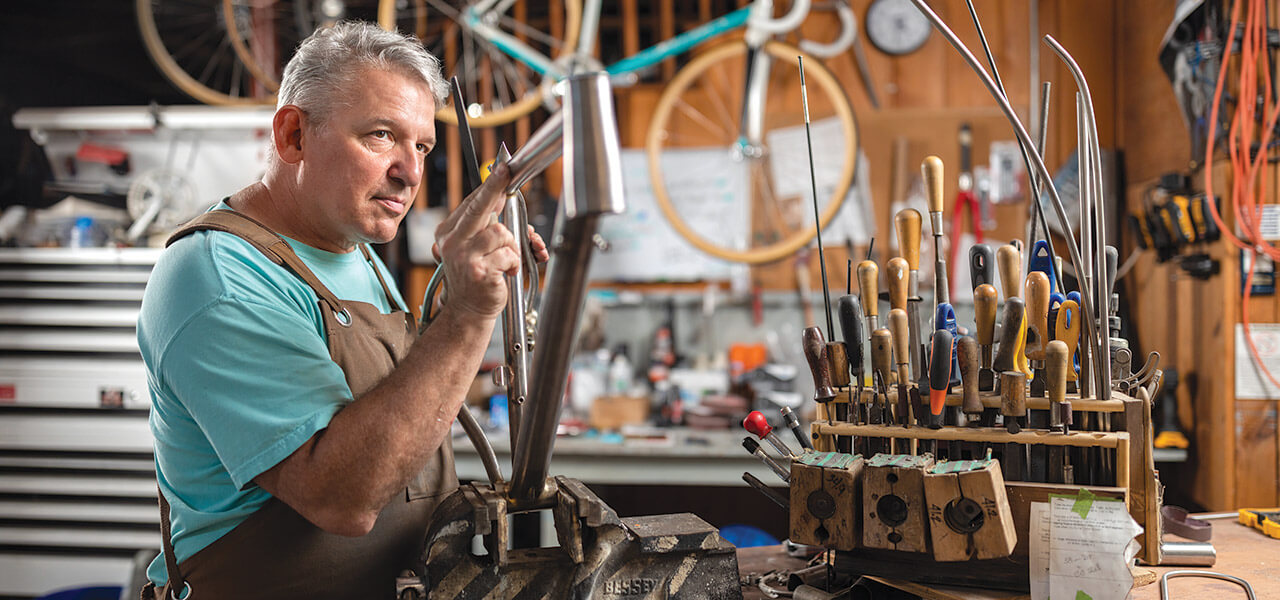 The bicycle shop in David Johnson’s suburban garage in Winston-Salem is a laboratory of painted tubes, work stands, and tools. Frames hang from the ceiling, and completed bikes draped in protective plastic coverings await pickup. A whiteboard lists all of the orders on Johnson’s six- to eight-month waiting list, with notes on each client. It’s clear that this 55-year-old bicycle maker loves every step in the process of turning tubes of steel into tailor-made two-wheeled wonders. “A bicycle is one of the most unique environments that you’ll ever put yourself in,” he says. “You’re the engine, you’re the pilot, you’re the passenger, you’re the navigator.” He pauses and chuckles. “And you’re hopefully enjoying yourself. If you’re not happy, something’s wrong.”