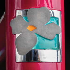 Johnson creates his head badges by curving a piece of stainless steel, brazing it with silver, and blasting the dogwood flower for a textured finish. photograph by Jerry Wolford & Scott Muthersbaugh