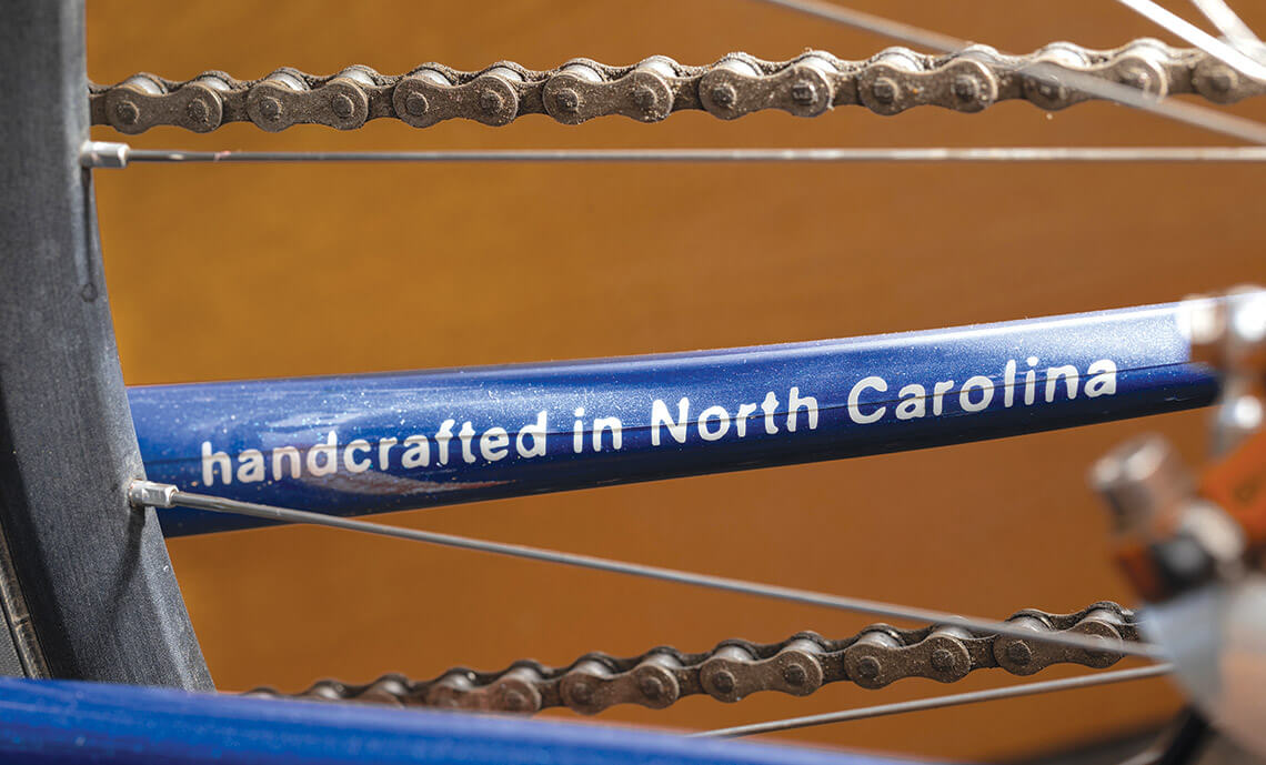 Johnson compares his craft — its emphasis on time, workmanship, and exacting standards geared for maximum joy — to that of creating the high-quality barbecue that North Carolina is famous for. That’s why the signature iconography for his Dogwood Cycleworx brand is a rotund hog frolicking in front of the Cape Hatteras Lighthouse. Black outlines of the swine hide out in an inconspicuous nook on the frame, right behind the pedals. “In this state, barbecue is a religion that starts with an oink,” he says. “So this is my way of saying that this bicycle is handcrafted. It’s my ode to North Carolina.” The head badge — the metal logo on the tube at the front of the bicycle — is a stylized dogwood flower. Lest the message be unclear, the words “handcrafted in North Carolina” adorn each bike that rolls out of this shop.