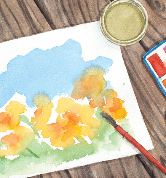 While she went to the backyard to snip tulips, I found a spot in the sunshine on the front porch and carefully laid out my wares: my tin of paints, a stack of paper with a rock on top to guard against the wind, a jelly jar filled with water. I had no shortage of subjects for painting: yellow warblers that came to feed at my grandmother’s bird feeder, tufts of green clover that sprouted all over the yard, golden stalks of forsythia that grew along the edge of the porch, daffodils that swayed in the flower beds, and a soft blue springtime sky hanging above it all.