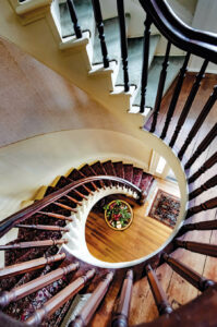 The look of the Elmwood 1820 Bed & Breakfast Inn commands attention, including the mansion’s spiral staircase that connects the home’s three floors. photograph by Charles Harris