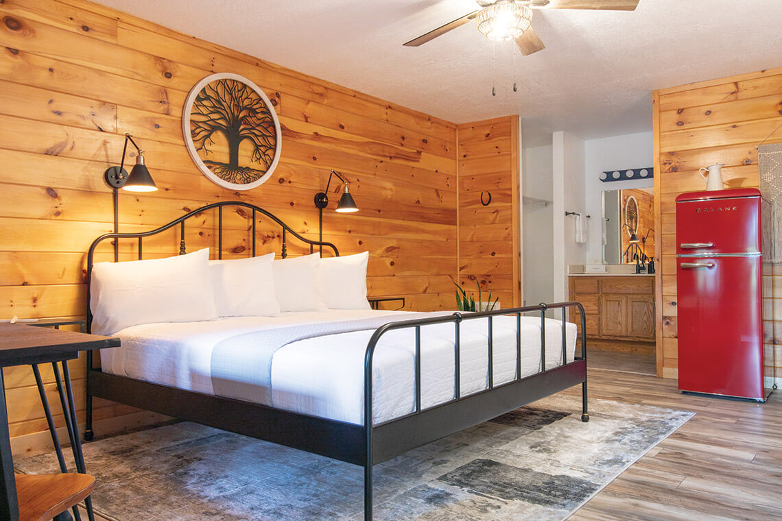 The four bedrooms in the Mitchell Lodge — one of five lodges, comprising 16 rooms/suites total — boast king-size beds and mattresses made of organic materials. photograph by SEAN BUSHER IMAGERY
