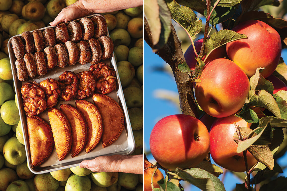 Fried apple pies, apple cider doughnuts, caramel apples, and hot and cold cider are on the menu at the Justus Orchard Apple House Bakery. photograph by Jack Sorokin