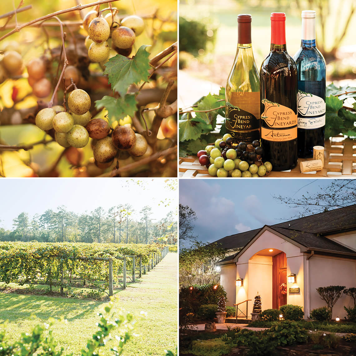 The 35 acres of muscadine grapes that Tina and Dan Smith planted for Cypress Bend Vineyards are part of a 1,000-acre plot of land that Dan’s ancestors purchased when they came over from Scotland in 1807. The couple wanted to continue the family’s tradition of farming, and Dan’s father was growing muscadines on a smaller scale for juice and jellies. The Smiths discovered that their mix of sandy and clay soil was perfect for growing the grapes. Now, more than two decades later, the winery produces 14 wines. Visitors to the tasting room can pack a picnic and sit on the patio, take a tour, or pick their own grapes from the vineyard from late summer to early fall.