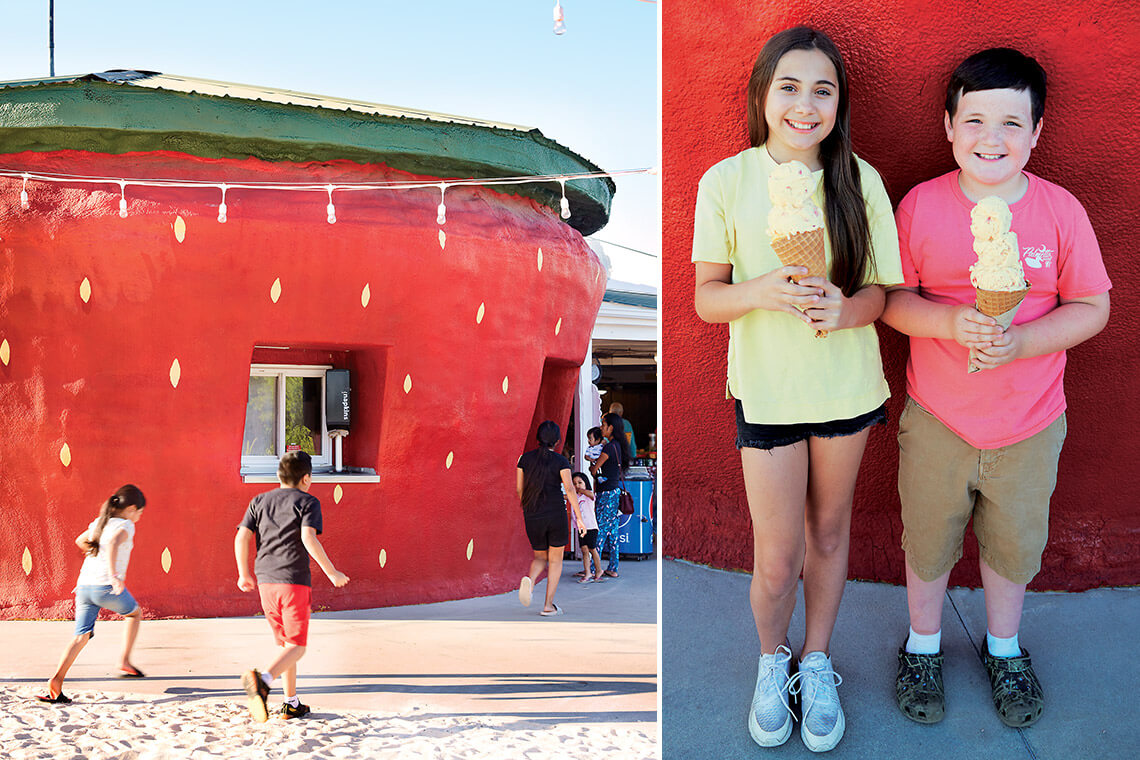 When asked if The Berry Patch’s ice cream stand is really housed in the world’s largest strawberry, owner Lee Berry replies, “I’ve never seen one bigger.” Opposite: Juliana Ciprani, 11, and Easton McAuley, 9, enjoy the cold treats found inside. photograph by Stacey Van Berkel