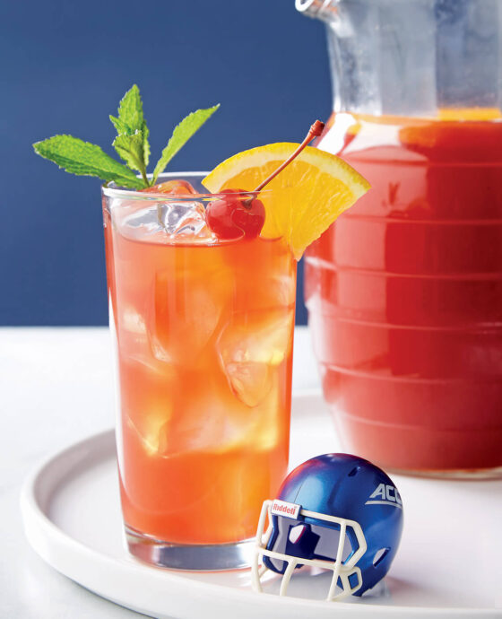 Yield: 6 servings. 4 cups water 3 family-size tea bags (black or orange pekoe) 1 cup pineapple juice ¼ cup cherry juice ¼ cup grenadine 6 orange slices (for garnish)