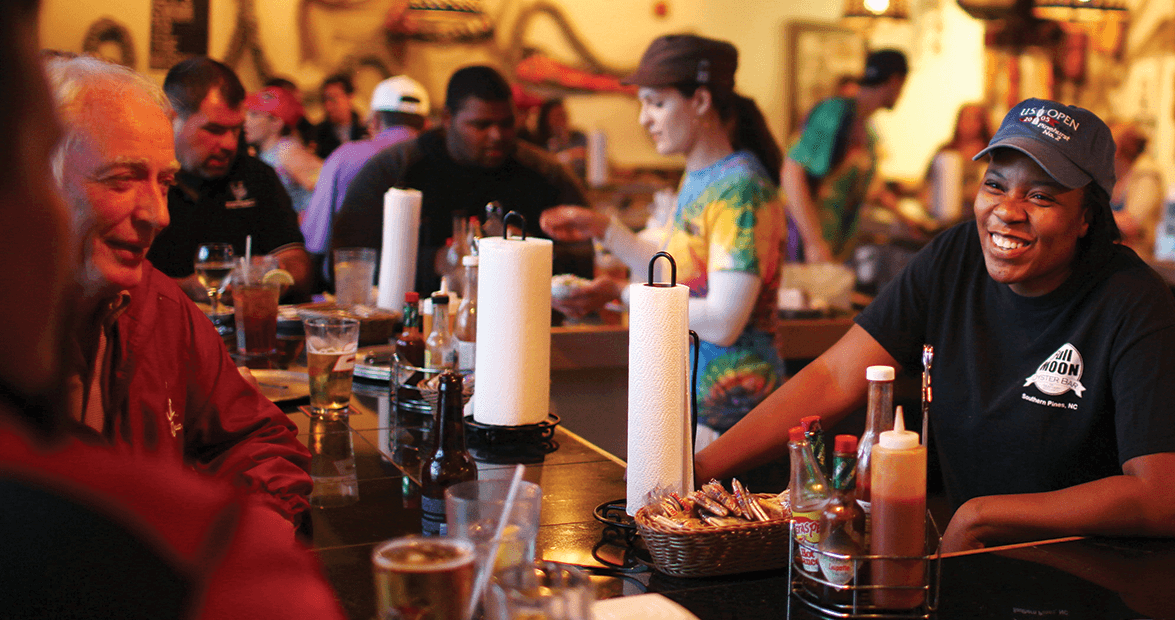 Russell and several of his friends came up with the idea over beers one night. Russell drew up some plans on a napkin, and “the next thing I knew,” he says, “we had a restaurant. We thought of the name, and what we could do with the concept. We started laughing and having fun with it, and it just stuck.” They opened Full Moon in Clemmons 11 years ago, expanded to Southern Pines last year, and have plans to open Jamestown and Morrisville locations within the year. On a busy Wednesday night at the Clemmons location, people come and go beneath a sign bearing Full Moon’s motto: “Come as a stranger, leave as a friend.” When a girl celebrating her 16th birthday decides to take on the Quarter Moon Challenge — a raw oyster on a saltine with jalapeño, horseradish, black pepper, and hot sauce — everyone around her cheers her on. She eats six to win a tie-dye T-shirt, and when she finishes, the applause rings out from all corners of the bar.