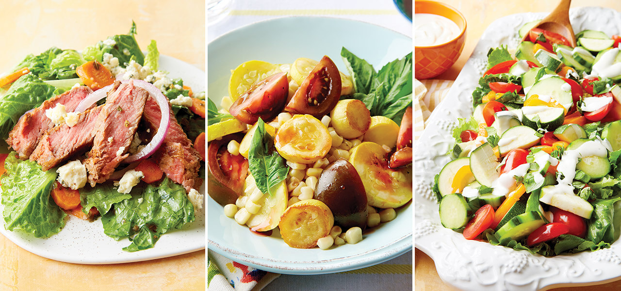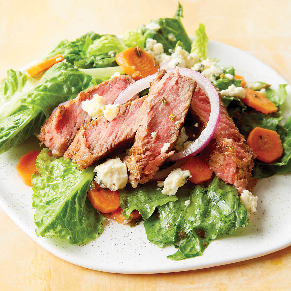 For the salad: Tear lettuce into bite-size pieces and place in a large bowl. Drizzle about ¼ cup vinaigrette over lettuce and massage until lettuce is coated. Distribute lettuce among salad plates. Top with steak, onion, carrots, and blue cheese. Add more dressing to salads, if desired. Refrigerate extra vinaigrette for up to 2 weeks.