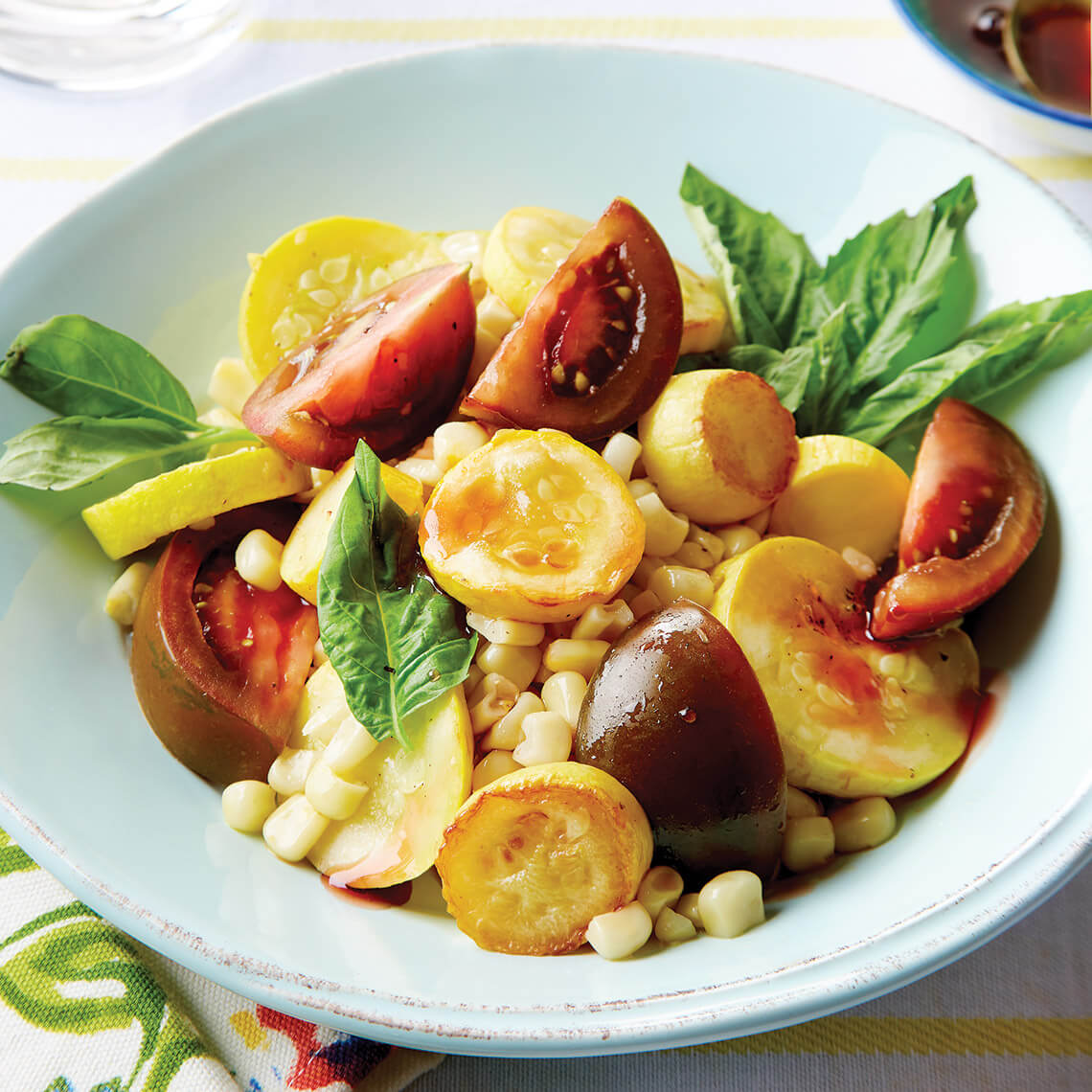 In a large skillet, sauté squash in olive oil on medium-high heat for 2 to 3 minutes. Remove from skillet and place squash in a large bowl. Add corn, tomatoes, salt, and pepper; toss ingredients together. Just before serving, add basil leaves and drizzle balsamic glaze over vegetables. Serve at room temperature or chilled.